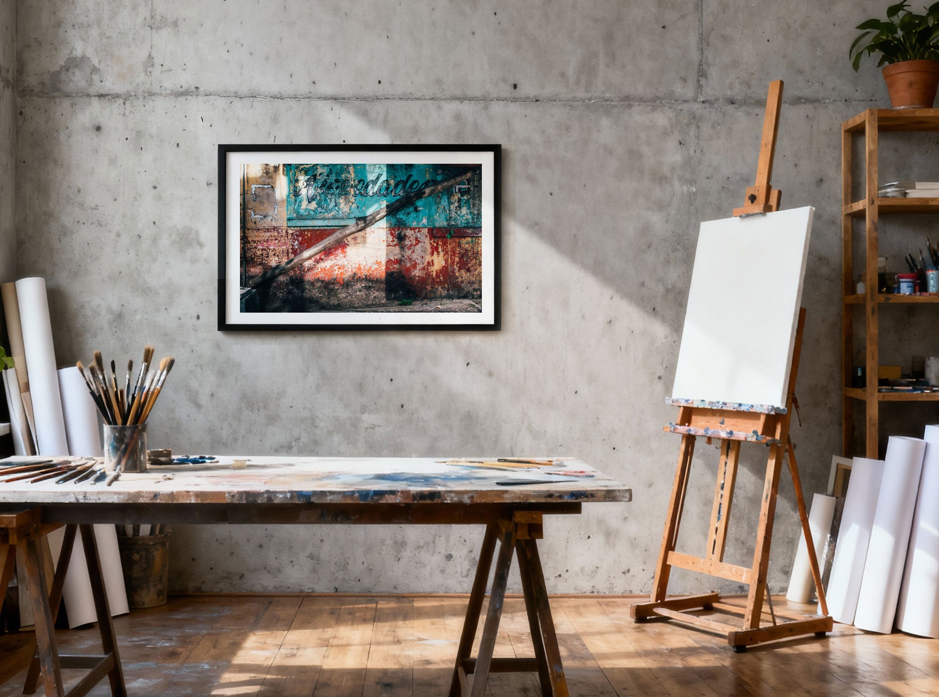 Als die Sonne tiefer sank, traf ihr Licht diesen vergessenen Winkel von Colón. Türkise Träume und das letzte Flüstern alter Werbung klammern sich an die verrostete Wand. Der diagonal verlaufende Holzbalken ist wie ein stiller Zeuge, der die Geschichten von Generationen verbirgt, die hier gelebt haben. Die Farben brennen – eine rohe, ehrliche Schönheit, die das ungeschminkte Herz der Stadt an einem panamaischen Nachmittag freilegt.