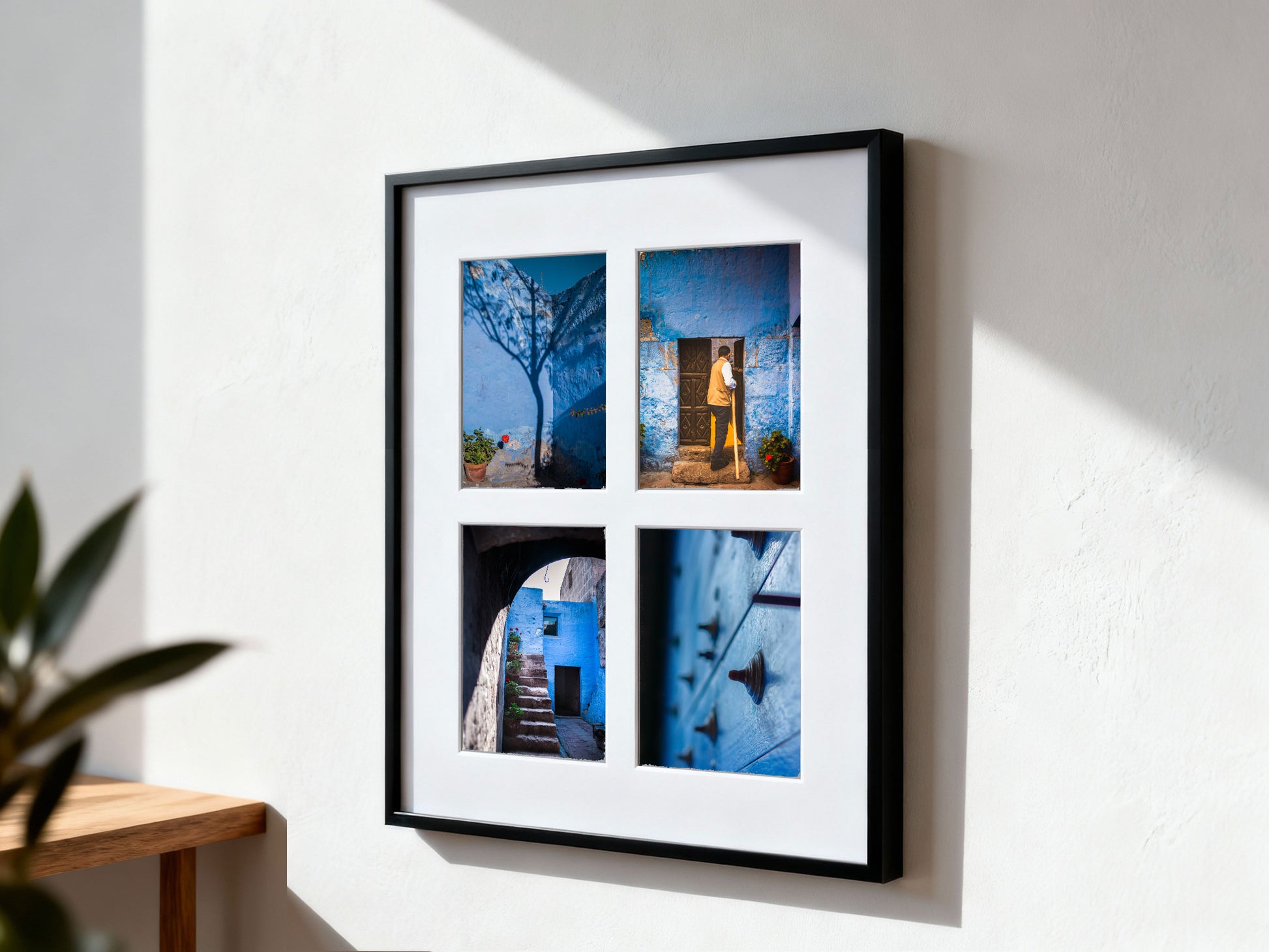 Arequipa, ein Kloster, Nachmittagslicht. Blaue Wände, die im Schatten kühl und in der Sonne glühen. Dieses Set versammelt vier Momentaufnahmen aus einem Ort, an dem die Zeit langsam vergeht: Türen, Stufen, Texturen – und eine Begegnung im Vorübergehen.
