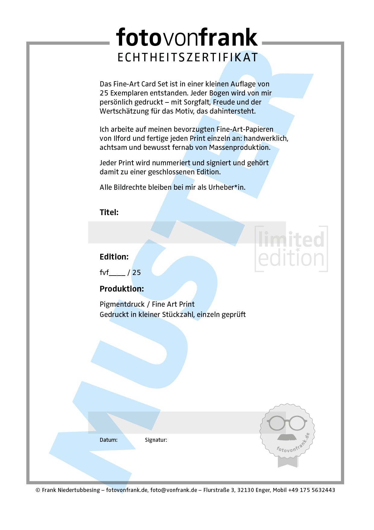 - Limitierte Auflage: 25 Fineart Prints pro Format