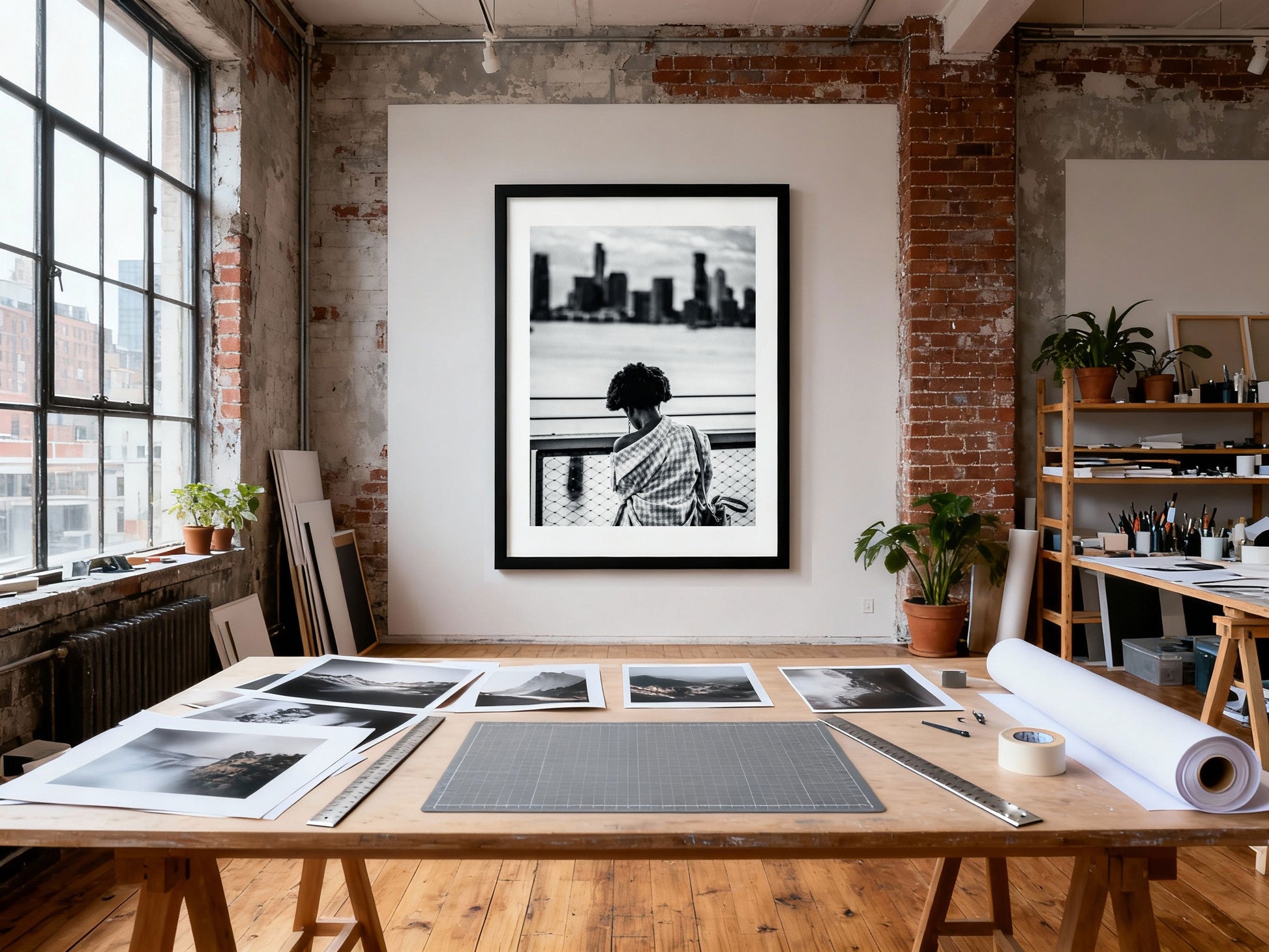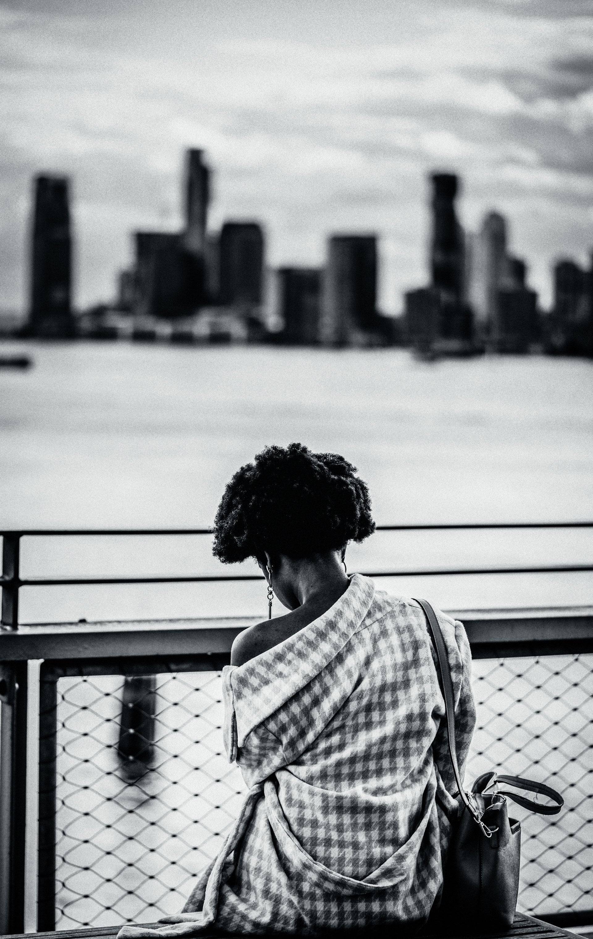 NYC am Wasser. Eine stille Minute am Pier, Rücken zur Stadt. Die Skyline verschwimmt, der Moment bleibt klar. Ein Bild voller Erwartung.